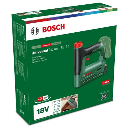 Sponkovačka UniversalTacker 18V-14 je akumulátorové náradie na nastreľovanie sponiek a klincov do celého radu materiálov: papiera, kartónu, mäkkého aj tvrdého dreva. Pri práci s rôznymi materiálmi a dĺžkou sponky je možné otáčaním kolieska nastaviť optimálnu silu rázu. Systém Push + Release zaručuje optimálnu kontrolu počas práce tým, že eliminuje samovoľné spustenie. Na rýchle upevňovanie, napríklad fólie do vyvýšených záhonov, je možné využiť funkciu spodného nastreľovania až 30 príklepov za minútu. Vďaka praktickému ukazovateľu stavu zásobníka rýchlo zistíte, kedy treba sponky doplniť. Zabudovaná technológia Bosch Syneon poskytuje optimálnu výkonnosť a maximálnu dobu chodu. Toto náradie patrí do systému 18V Power For All Alliance a je možné tak použiť jeden akumulátor pre všetky aku náradia tohto radu.