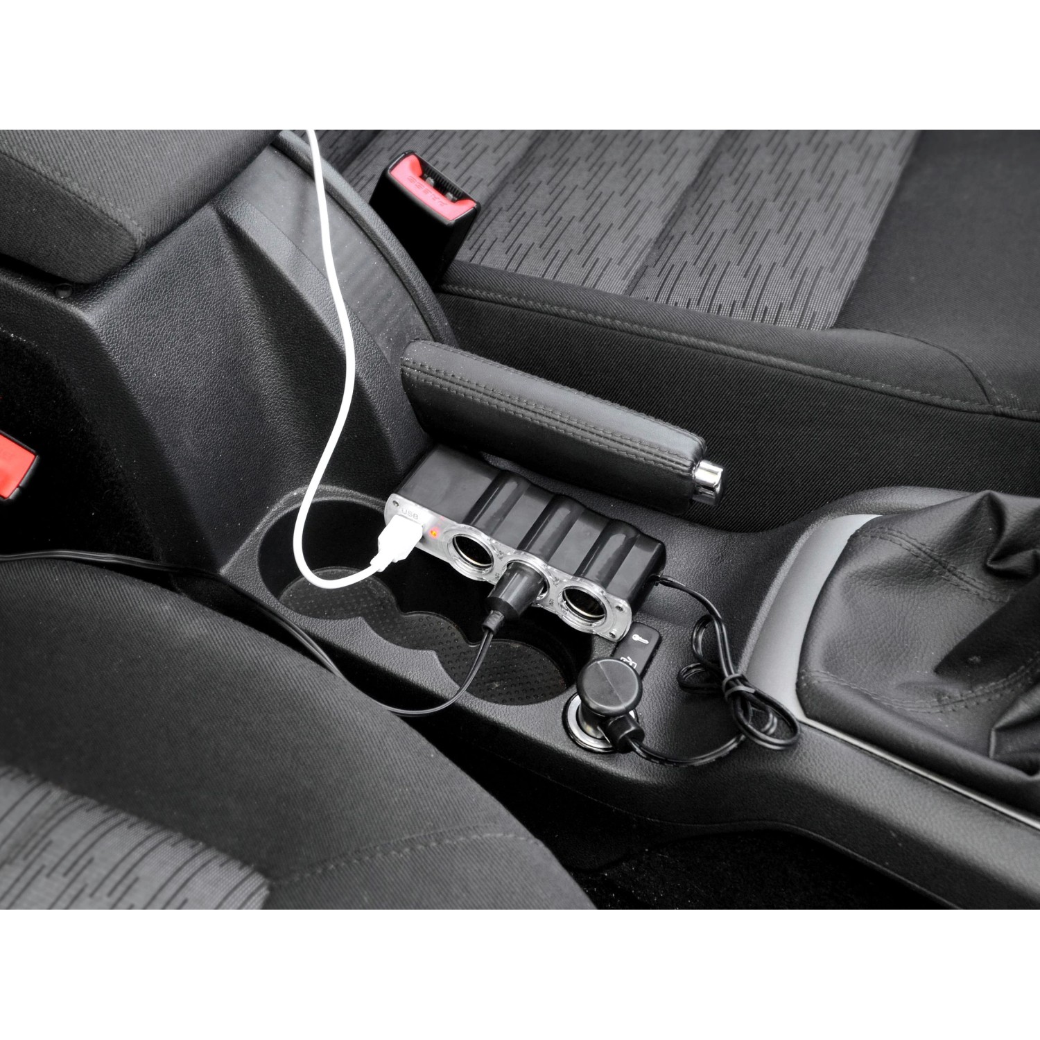 Roztrojka zásuvky automobilového zapaľovača 12 V s USB konektorom, umožňuje pripojenie viacerých spotrebičov k jednej štandardnej zásuvke zapaľovača v automobile a zároveň napájať či nabíjať USB zariadenie z 12 V zásuvkou automobilového zapaľovača.