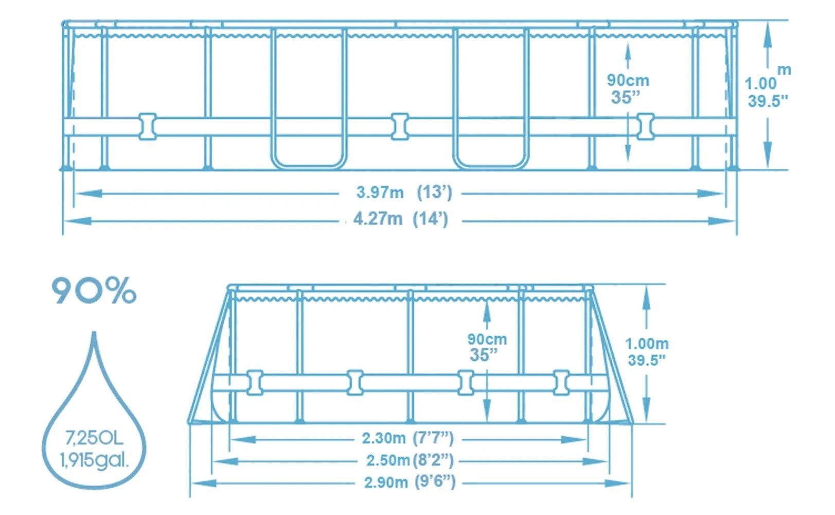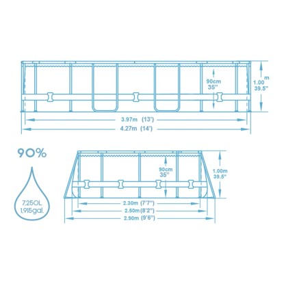 Bazén poskytuje osviežujúce a ukľudňujuce ochladenie v horúcich letných dňoch. S rozmermi 427 cm x 250 cm v oválu a výškou 100 cm ponúka bazén s kovovým rámom dostatok priestoru pre príjemné kúpanie vo vašej záhrade. Vďaka kvalitnému výberu a spracovaniu materiálu je kovový rám bazénu extrémne odolný aj pri náročnom používaní. Bez náradia možno bazén ľahko a rýchlo zostaviť. Rám je vyrobený z kovu odolného proti korózii, bočné steny PVC fólia. Bazén má kapacitu vody 7,250 l (plnenie 90 %). Výkon filtračného čerpadla (220 V - 240 V) predstavuje 1 817 l/h.