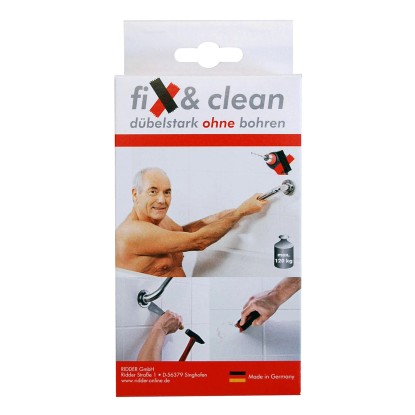 Vďaka tomu získate trvalé upevnenie vaňových držadiel celkom bez použitia vŕtačky. Okrem lepidla Fix & Clean nie je potrebné žiadne ďalšie náradie a po demontáži je možné odstránenie bezozvyšku. Lepený spoj je možné už po 24 hodinách stopercentne zaťažiť a overiť nosnosť 120 kg testovanú LGA.