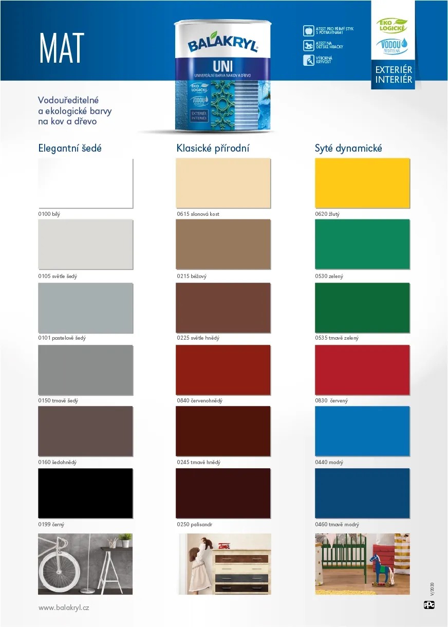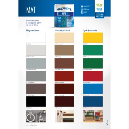 BALAKRYL UNI MAT je vodou riediteľná matná farba s univerzálnym použitím určená na nové aj renovačné vrchné nátery kovu, dreva, PVC, betónu, omietok a ďalších materiálov v interiéri aj exteriéri.