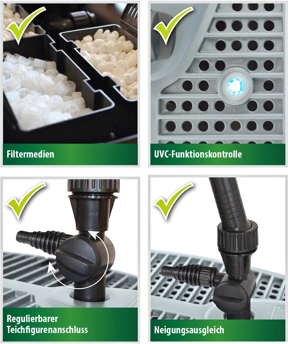 Smartline súprava podvodného filtra Heissner s integrovaným čističom UVC (11 W) má čerpací výkon 2000 l/h 0,00056 m3/s a je ideálna pre jazierka s objemom do 5000 litrov (2500 litrov s rybami). Veľkoplošné teleso filtra s mechanickým filtračným stupňom zaručuje extrémne dlhé intervaly čistenia. Všetky filtračné komponenty sú prakticky neviditeľné na dne jazierka. Čerpadlo a UVC čistič jazierka sú vybavené oddelenými prívodmi prúdu, vďaka čomu je umožnené dočasné vypnutie UVC čističa jazierka. Okrem toho je súprava vybavená regulovateľnou prípojkou pre jazierkovú figúrku a teleskopickým stúpacím vedením s vyrovnávaním sklonu a reguláciou dodávaného množstva. Čerpadlo má navyše vyvažovanie sklonu a funkčnú kontrolu UVC. Súčasťou dodávky sú 3 vodné hry (kaskáda, široká kaskáda, zvon).