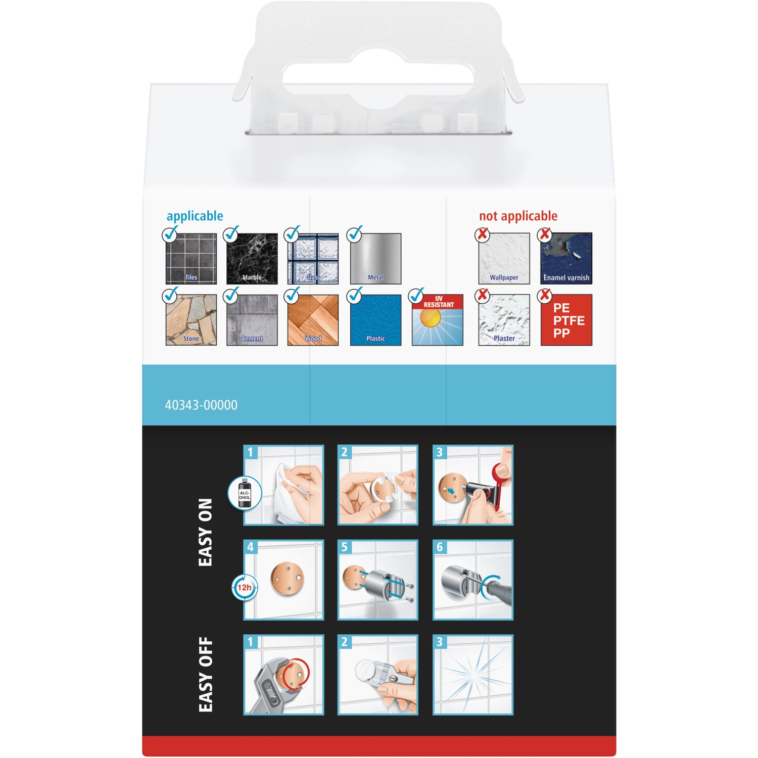 Na pripevnenie sa používa lepidlo. Vŕtanie nie je potrebné a nedôjde ani k žiadnemu poškodeniu stien alebo obkladov. Lepidlo zasychá za 12 hodín. Držiak môžete rýchlo a bez stopy demontovať, kedykoľvek chcete. S novým adaptérom BK27 ho môžete tiež opäť pripevniť na inom mieste.