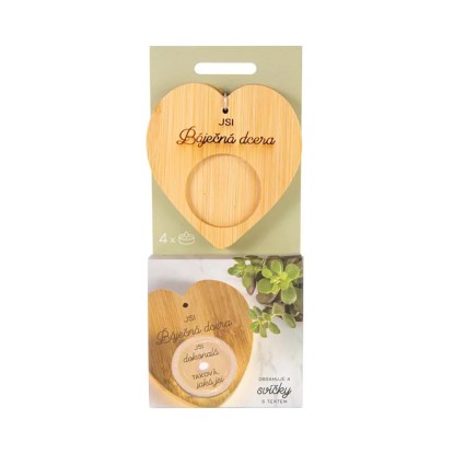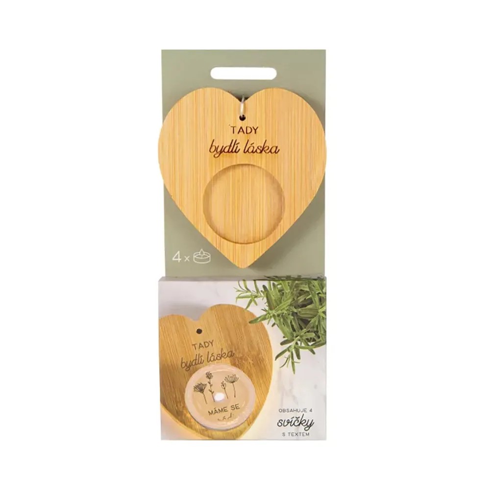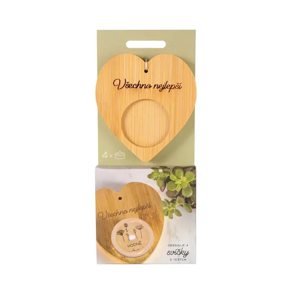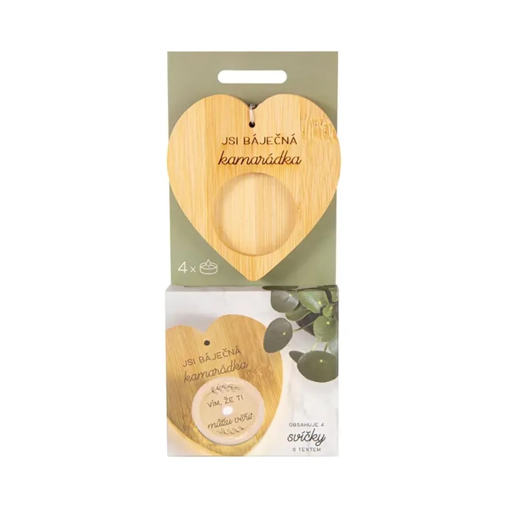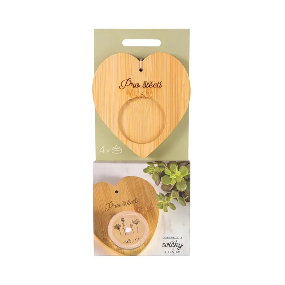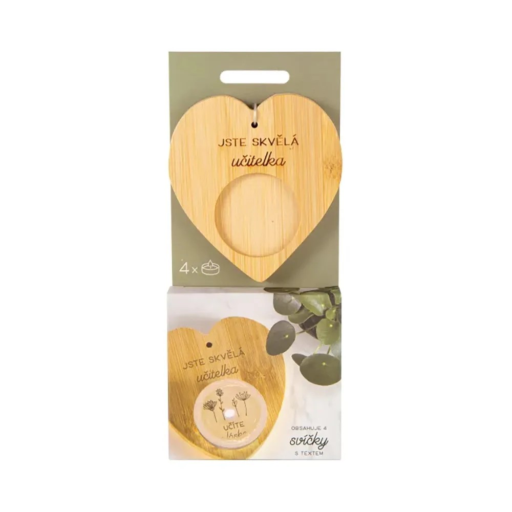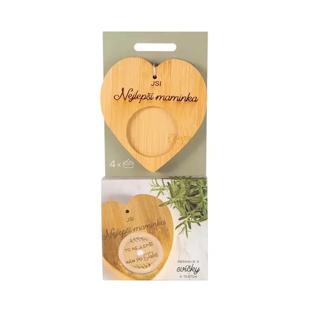 Darčekové balenie bambusového svietnika s venovaním a 4 sviečok s milým textom, ktorý sa magicky objaví až po rozohriatí vosku. Umiestnite sviečku do bambusového svietnika s venovaním a vychutnajte si moment, kedy sa vo svetle plápolajúceho plameňa odhalí tajomstvo skryté pod vrstvou rozohriateho vosku. Sviečky s prekvapením sú vhodné ako darček pre mamičku, babičku alebo pani učiteľku. Môžete ich venovať k narodeninám, na Vianoce alebo len tak pre šťastie.