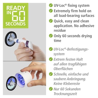 Pre montáž na stenu je ku kúpeľňovému doplnku priložený jedinečný lepiaci systém UV-Loc značky Wenko, ktorý zaručuje extrémne pevné upevnenie na akomkoľvek nosnom povrchu, ako sú dlaždice alebo sklo. Pripevníte ho ľahko a čisto bez zvyškov lepidla. Jednoducho stiahnite ochrannú fóliu a pripevnite systém Loc na stenu. Lepidlo naplňte do komôrok systému Loc a následne nechajte vytvrdiť priloženou UV lampou. Čakacia doba je iba 60 sekúnd. Po montáži na stenu je možné upevňovací prvok ihneď a trvalo zaťažiť (až 90 kg na jedno upevňovacie miesto systému Loc) - nie je nutná žiadna ďalšia čakacia doba. Rovnako ľahko sa dá upevnenie opäť bezo zvyšku odstrániť - k tomu je potrebný iba sušič vlasov a špachtľa.
