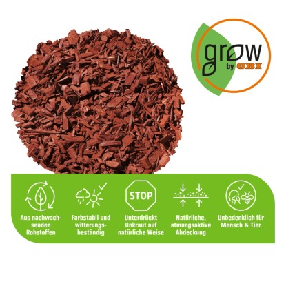 Dekoratívna mulčovacia kôra GROW by OBI vďaka svojej intenzívnej farbe skvele zvýrazní záhony aj jednotlivé rastliny. Je ideálny na dekoratívnu úpravu záhrad s dôrazom na individuálne akcenty. Okrem toho je možné tento drevený dekoračný mulč použiť aj pre rastliny v nádobách v interiéri, na balkóne alebo na terase.