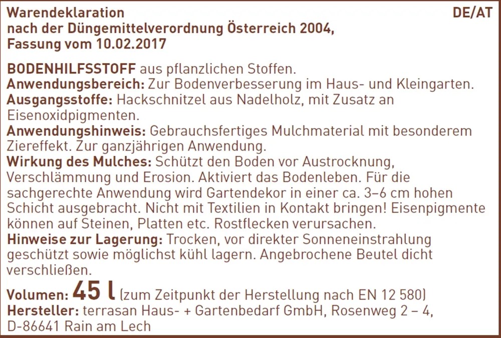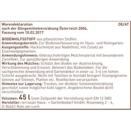 Tento dekoratívny mulč je vysoko kvalitná povrchová vrstva, ktorá v sebe spája niekoľko pozitívnych vlastností. Na dosiahnutie obzvlášť intenzívneho a dlhotrvajúceho sfarbenia sú k ihličnatej štiepke pridané pigmenty oxidu železa. S frakciou do 40 mm je tento materiál v starostlivosti o záhradu všestranne využiteľný. Dekoračný mulč zaisťuje dobré prevzdušnenie pôdy a zamedzuje rastu buriny. Pôda pod ním navyše nevysychá tak rýchlo a zostáva dlhšie vlhká. Dochádza k zmierneniu teplotných výkyvov aj erózie a vďaka schopnosti akumulovať teplo sú citlivé rastliny chránené pred mrazom.
