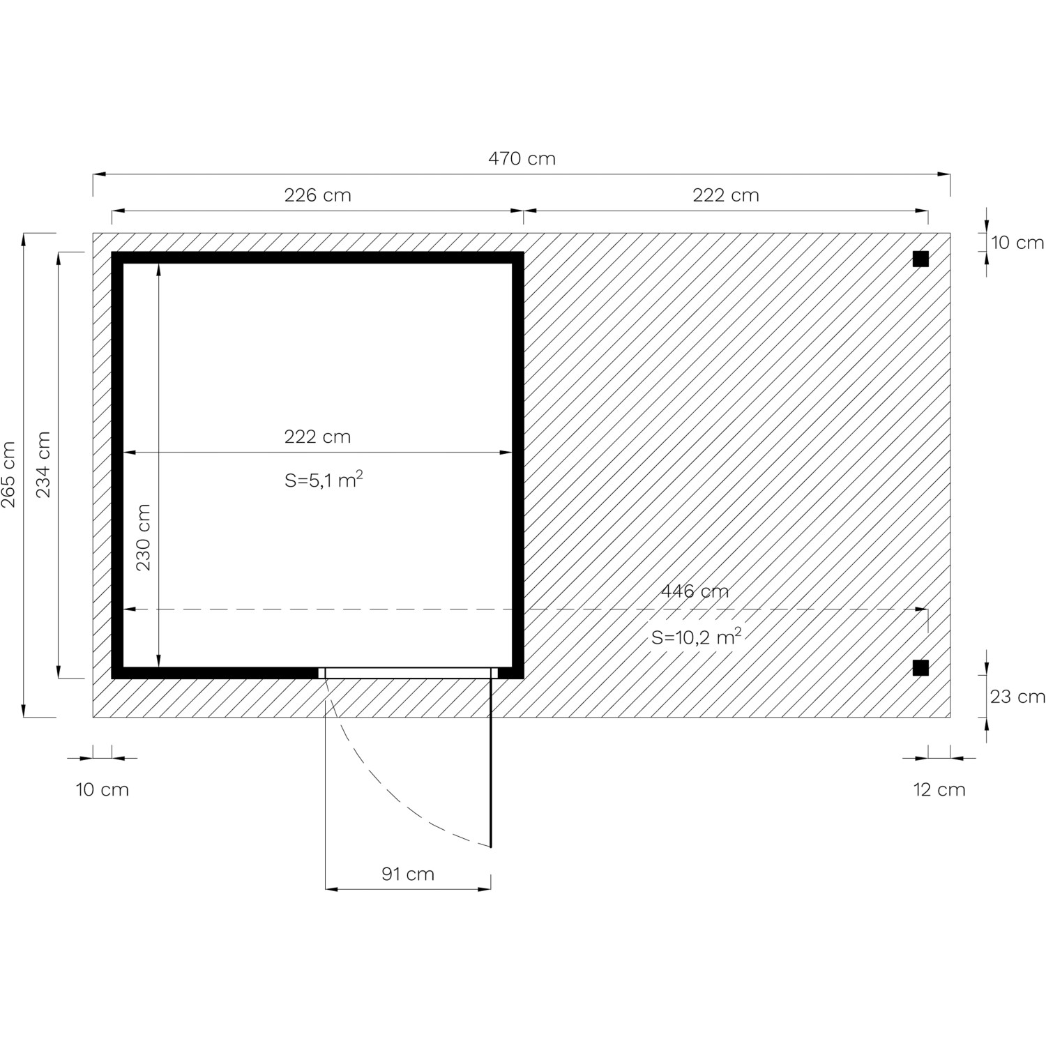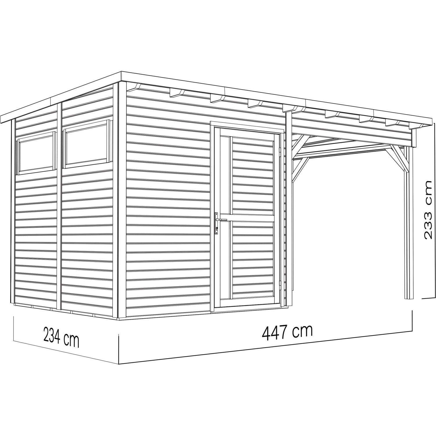 - Rozmery steny bez presahu strechy: 449 x 234 cm