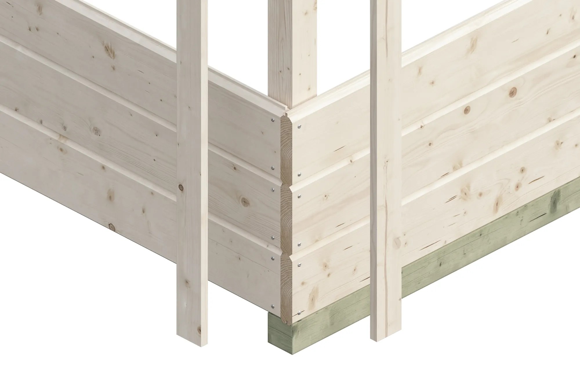 Všetky stenové dosky s hrúbkou 28 mm majú vyfrézovanú jednu jednoduchú drážku a jedno pero. Dosky sa zasunú do seba a rohové stĺpiky sa tupo spoja a zoskrutkujú.