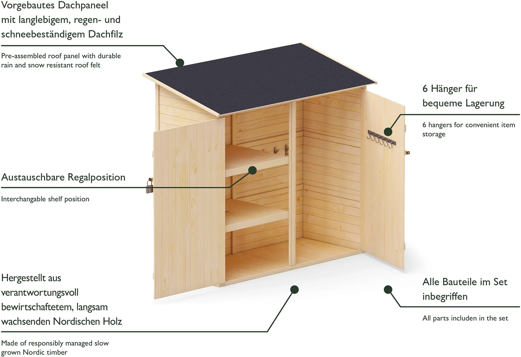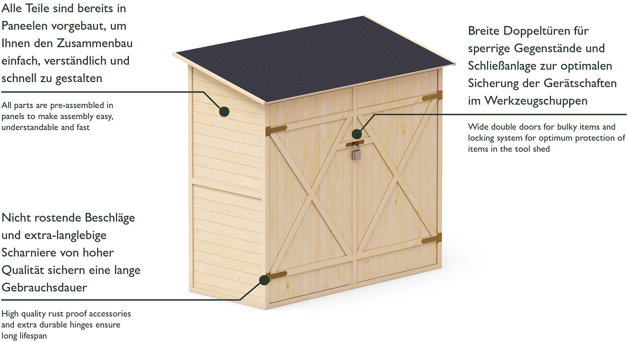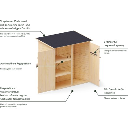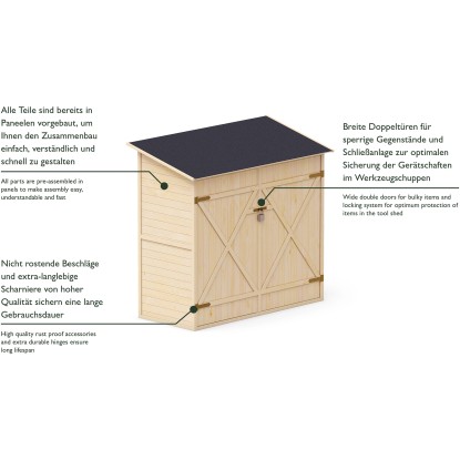 Všetky diely sú vopred zmontované do panelov, aby bola montáž jednoduchá, zrozumiteľná a rýchla. Široké dvojité dvere pre objemné predmety sú doplnené uzamykacím systémom na optimálnu ochranu predmetov. Vysoko kvalitné nerezové príslušenstvo a extra odolné pánty zaisťujú dlhšiu životnosť. Odolná strešná lepenka chráni pred dažďom a snehom.