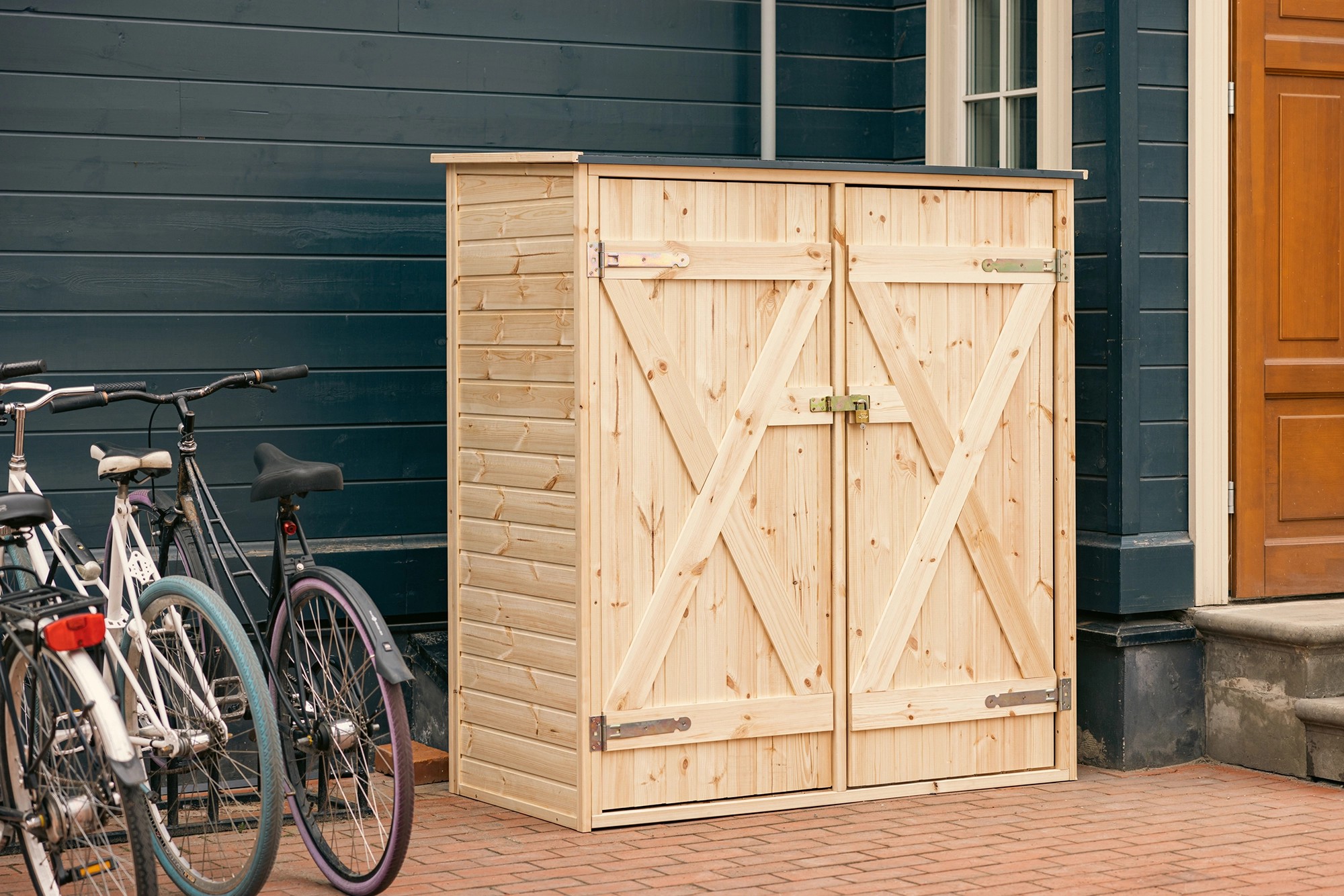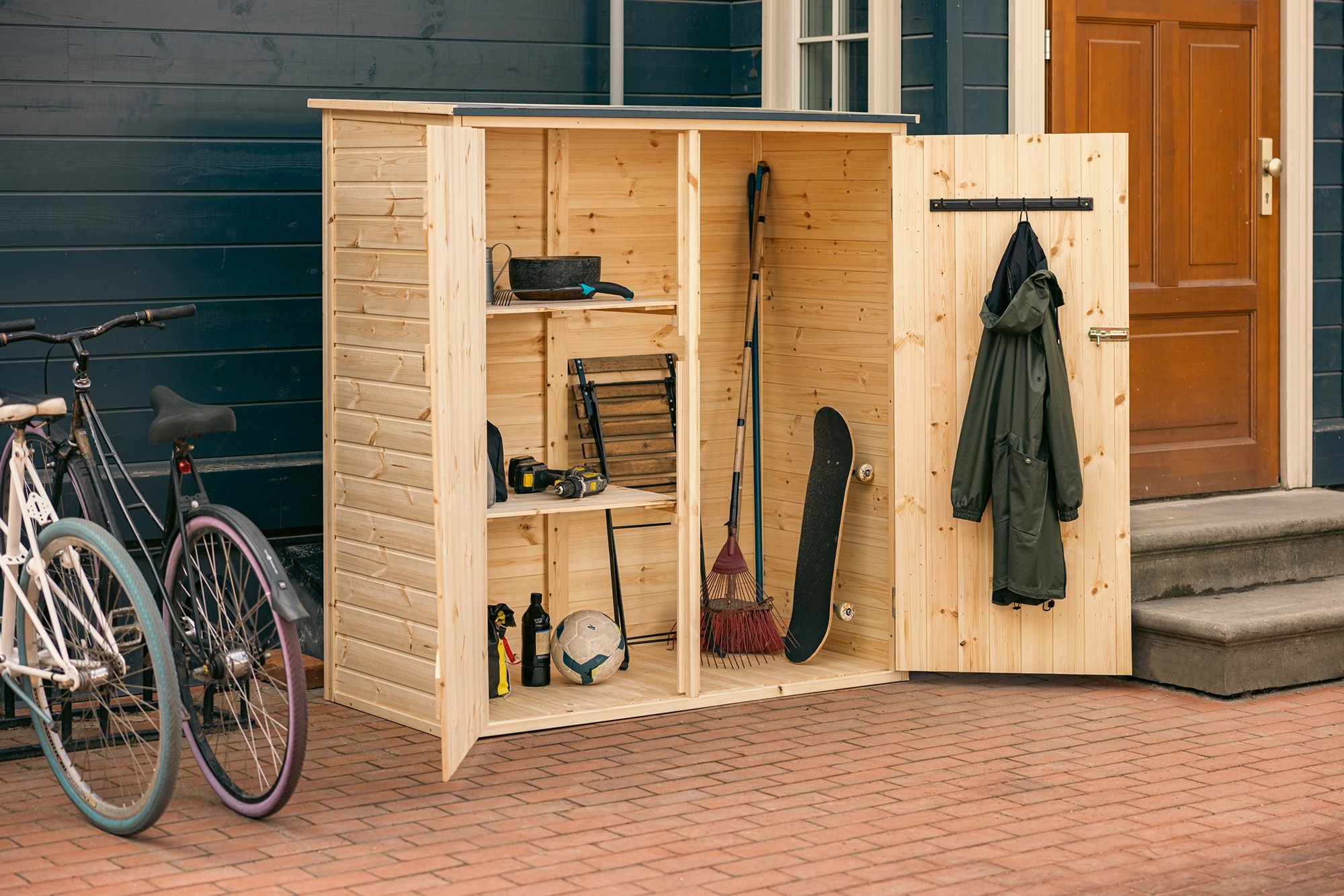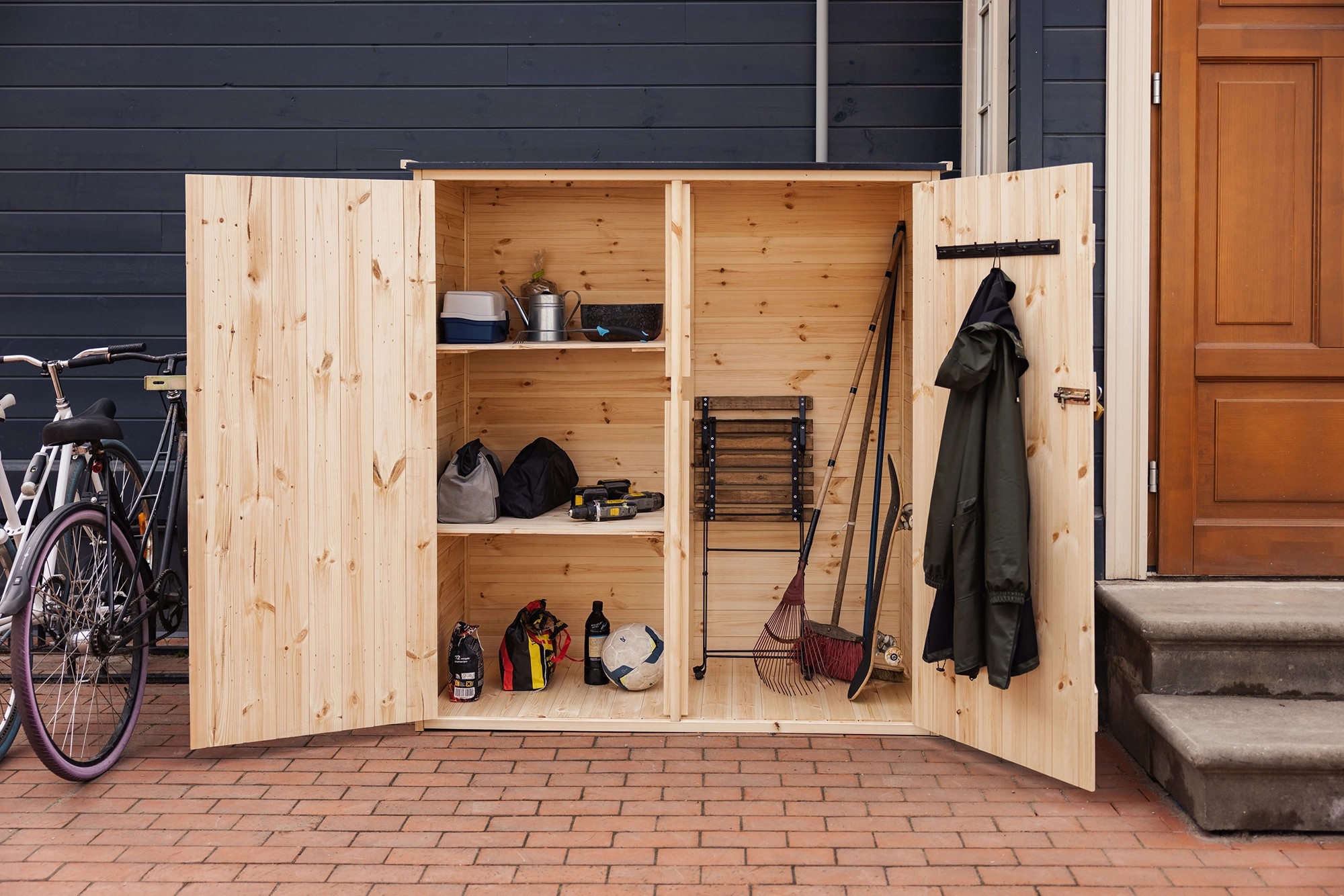 Všetky diely sú vopred zmontované do panelov, aby bola montáž jednoduchá, zrozumiteľná a rýchla. Široké dvojité dvere pre objemné predmety sú doplnené uzamykacím systémom na optimálnu ochranu predmetov. Vysoko kvalitné nerezové príslušenstvo a extra odolné pánty zaisťujú dlhšiu životnosť. Odolná strešná lepenka chráni pred dažďom a snehom.