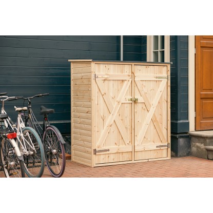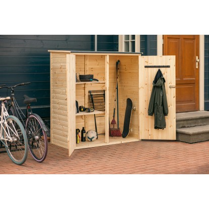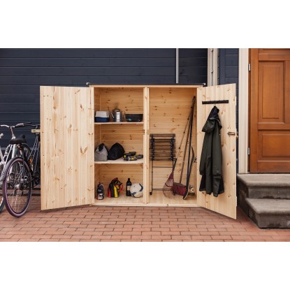 Dokonalé riešenie na skladovanie a ochranu menšieho záhradného náradia a vybavenia. Táto kôlňa na náradie s rozmermi 150 x 80 cm vyrobená zo zodpovedne získaného severského mäkkého dreva je dodávaná vo vopred narezaných paneloch pre rýchlu a jednoduchú montáž. Dve priložené prenastaviteľné police a 6 vešiakov umožňujú individuálnu konfiguráciu tak, aby vyhovovala konkrétnym potrebám vašej záhrady. Tento model je vyrobený z neošetreného dreva a pre väčšiu odolnosť proti poveternostným vplyvom je odporúčané pretrieť ho lakom alebo lazúrou.