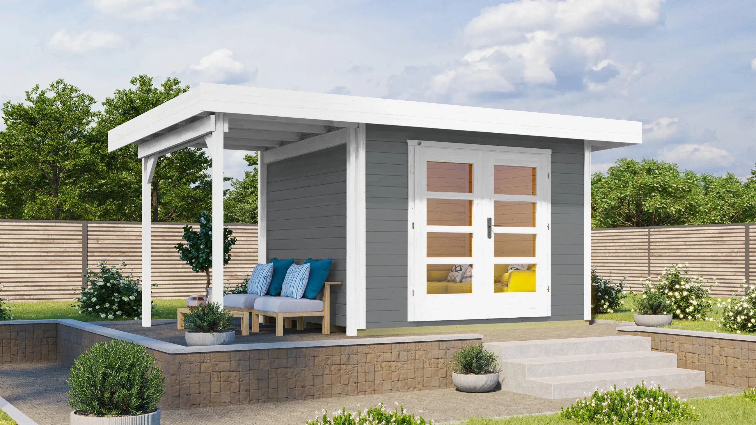 Záhradný domček z dreva sa vyznačuje moderným dizajnom a pritom má šedú farbu.