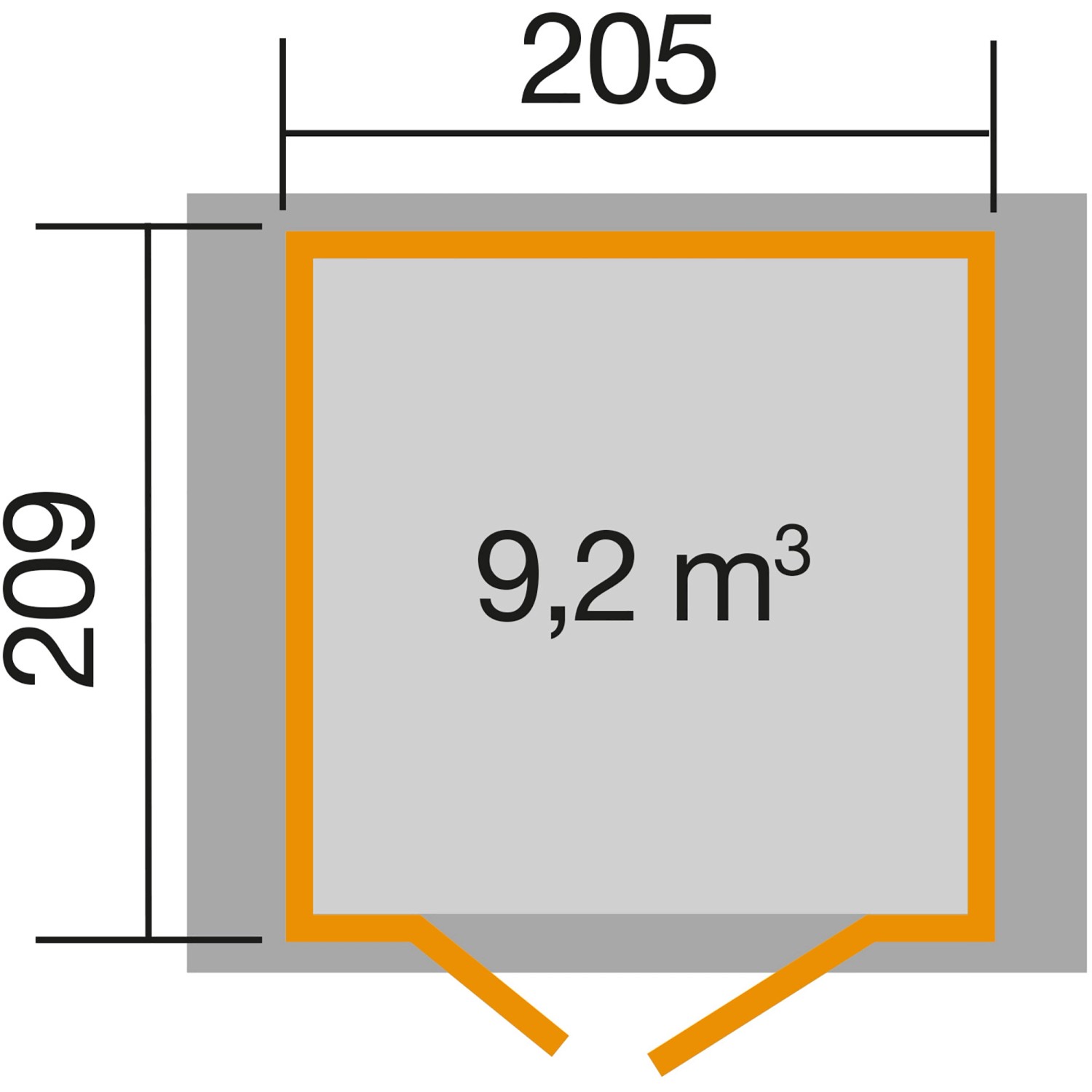 Súčasťou sady sú moderné dvojkrídlové dvere s kvalitnou sadou kľučiek, profilovým cylindrickým zámkom a 3 kľúčmi. Strecha presahuje z bočných strán o 27,5 cm, zo zadnej strany o 12 cm a z prednej strany o 12 cm. Vnútorné rozmery domčeka sú 205 x 209 cm (4,28 m2). Výška bočných stien je 196 cm.