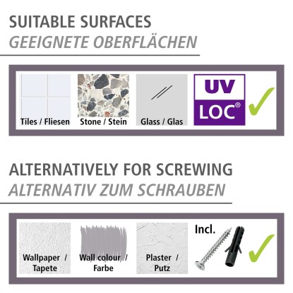 Pre montáž na stenu je ku kúpeľňovému doplnku priložený jedinečný lepiaci systém UV-Loc značky Wenko, ktorý zaručuje extrémne pevné upevnenie na akomkoľvek nosnom povrchu, ako sú dlaždice alebo sklo. Pripevníte ho ľahko a čisto bez zvyškov lepidla. Jednoducho stiahnite ochrannú fóliu a pripevnite systém Loc na stenu. Lepidlo naplňte do komôrok systému Loc a následne nechajte vytvrdiť priloženou UV lampou. Čakacia doba je iba 60 sekúnd. Po montáži na stenu je možné upevňovací prvok ihneď a trvalo zaťažiť (až 90 kg na jedno upevňovacie miesto systému Loc) - nie je nutná žiadna ďalšia čakacia doba. Rovnako ľahko sa dá upevnenie opäť bezo zvyšku odstrániť - k tomu je potrebný iba sušič vlasov a špachtľa.