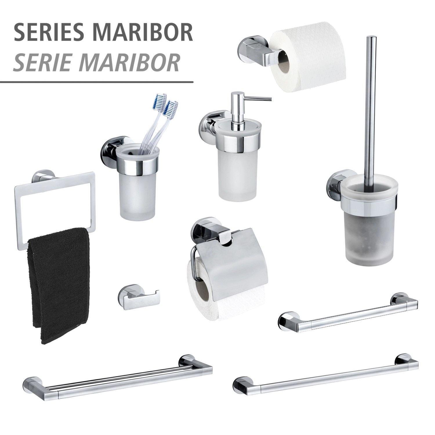 Doplnky pekne tvarovanej kúpeľňovej série Maribor majú lesklý povrch. Sú vyrobené z nerezovej ocele s montážnou úchytkou zo zinkového tlakového odliatku a prepožičiavajú kúpeľni luxusný nádych. Doplnky je možné upevniť pomocou priloženého systému UV-Loc. Na štandardné upevnenie sú súčasťou dodávky skrutky a hmoždinky.