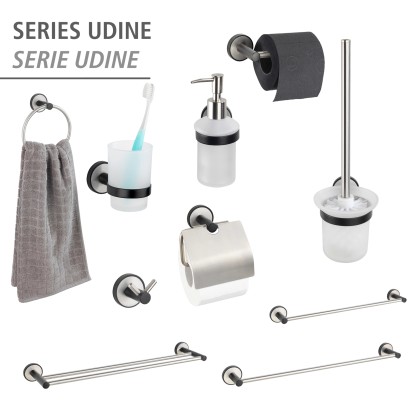 Doplnky kúpeľňovej série Udine premenia kúpeľňu na čisté miesto, v ktorom sa budete cítiť príjemne. Príslušenstvo z nerezovej ocele v kombinácii kartáčovaného vzhľadu a matne čierneho laku sa skvele začlení do kúpeľní zariadených v modernom a urbanistickom štýle. Doplnky je možné upevniť pomocou priloženého systému UV-Loc. Na štandardné upevnenie sú súčasťou dodávky skrutky a hmoždinky.