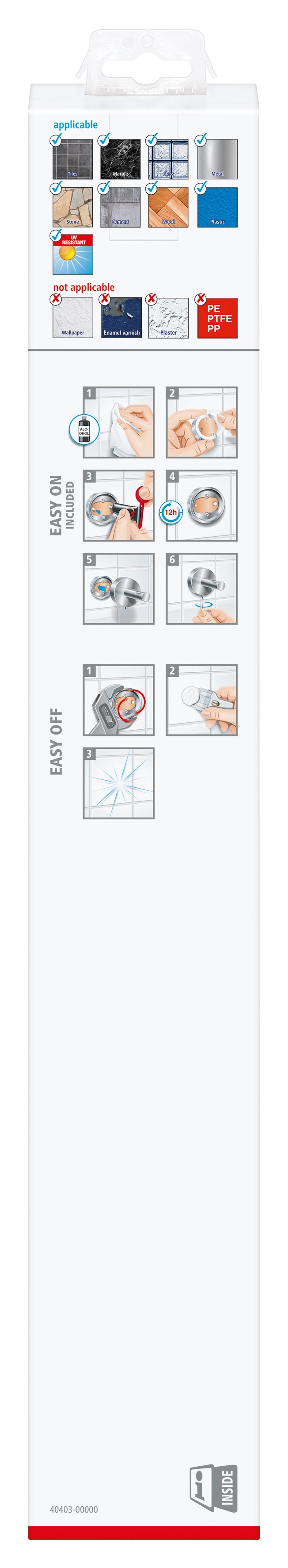 Predmet je možné ľahko a čisto pripevniť na stenu bez vŕtania alebo skrutkovania. Potom, čo nasadíte montážny adaptér a naplníte ho lepidlom, ktoré je súčasťou dodávky, počkajte 12 hodín a potom môžete položku bezpečne pripevniť natrvalo. Priložená upevňovacia súprava obsahuje upevňovací adaptér, lepidlo a imbusový kľúč pre fixáciu. Predmet je vhodný na pripevnenie na dlaždice, kov, prírodný kameň, mramor, sklo, drevo a mnoho plastov. Aj napriek prídržnej sile až 6 kg ho môžete kedykoľvek vybrať a znovu použiť s novým adaptérom (BK20).