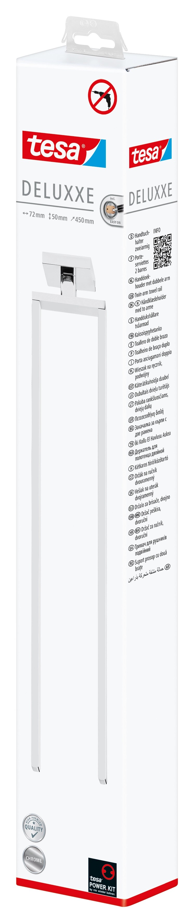 Kúpeľňové predmety Tesa zo série Deluxxe zaujmú svojim vycibreným dizajnom spojeným s kvalitou a funkčnosťou. V modernom chróme sa skvele hodí do každej kúpeľne alebo toalety pre hostí. A čo viac, praktické kúpeľňové predmety sú nerezové. Dvojramenný držiak na uteráky Tesa Deluxxe ponúka priestor pre 2 uteráky a bezpečne ich uloží na sušenie a na požadovanom mieste.