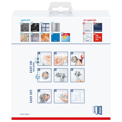 Predmet je možné ľahko a čisto pripevniť na stenu bez vŕtania alebo skrutkovania. Potom, čo nasadíte montážny adaptér a naplníte ho lepidlom, ktoré je súčasťou dodávky, počkajte 12 hodín a potom môžete položku bezpečne pripevniť natrvalo. Priložená upevňovacia súprava obsahuje upevňovací adaptér, lepidlo a imbusový kľúč na fixáciu. Predmet je vhodný na pripevnenie na dlaždice, kov, prírodný kameň, mramor, sklo, drevo a mnoho plastov. Aj napriek prídržnej sile až 6 kg ho môžete kedykoľvek vybrať a znovu použiť s novým adaptérom (BK20).