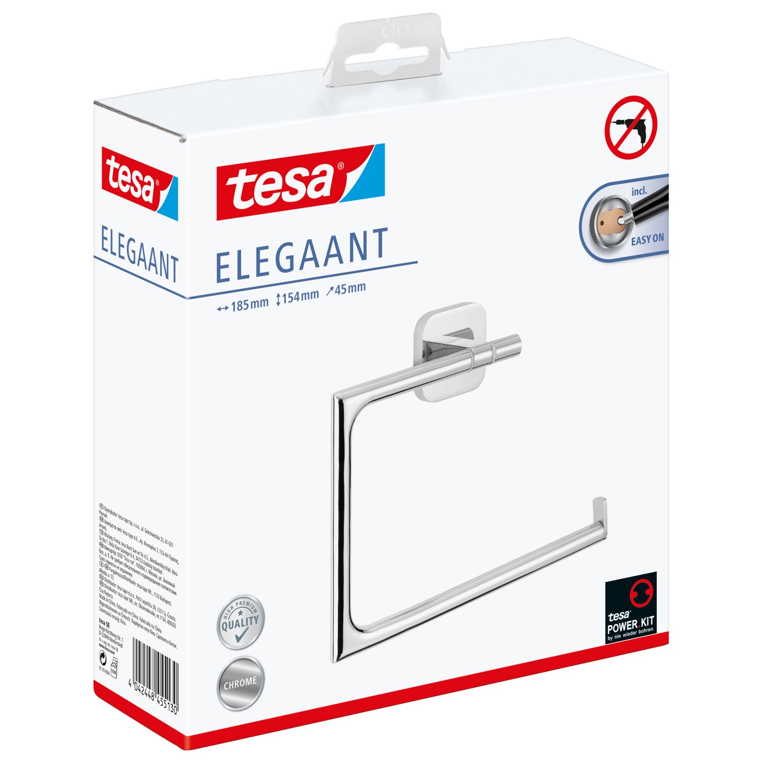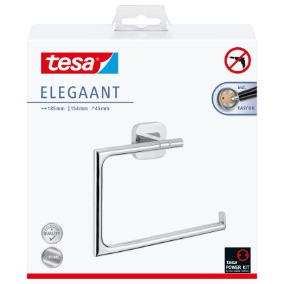 Kúpeľňové predmety Tesa zo série Elegaant sú skutočným obohatením každej kúpeľne alebo toalety pre hostí a zaujmú kombináciou skvelého vzhľadu a funkčnosti. A čo viac, praktické kúpeľňové predmety sú nerezové. Pootvorený krúžok na uteráky Tesa Elegaant udrží vaše uteráky vždy pripravené na požadovanom mieste a navyše zaberie veľmi málo miesta.