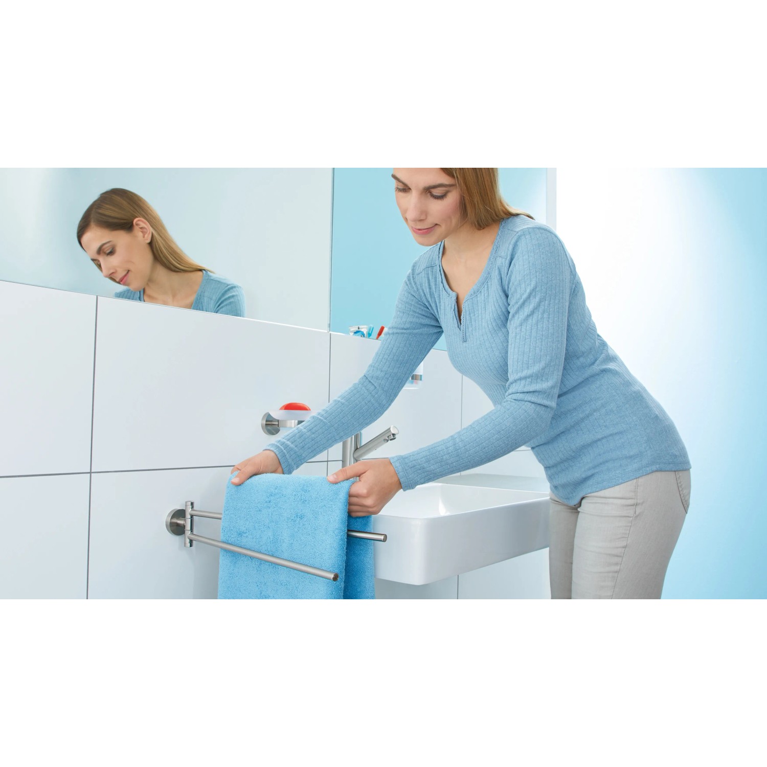 Dvojramenný otočný držiak na uteráky tesa Moon má štýlový vzhľad nerezovej ocele a ponúka dostatok priestoru na sušenie dvoch uterákov rôznych veľkostí. Ramená sú pohyblivé a predstavujú ideálne riešenie v úzkom priestore. Povrch je vodeodolný a má úpravu proti odtlačkom prstov.