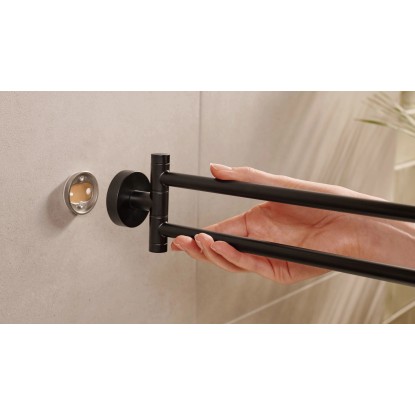 Dvojramenný otočný držiak na uteráky tesa Moon má štýlový vzhľad práškovo lakovaného kovu a ponúka dostatok priestoru na sušenie dvoch uterákov rôznych veľkostí. Ramená sú pohyblivé a predstavujú ideálne riešenie v úzkom priestore. Povrch je vodeodolný.