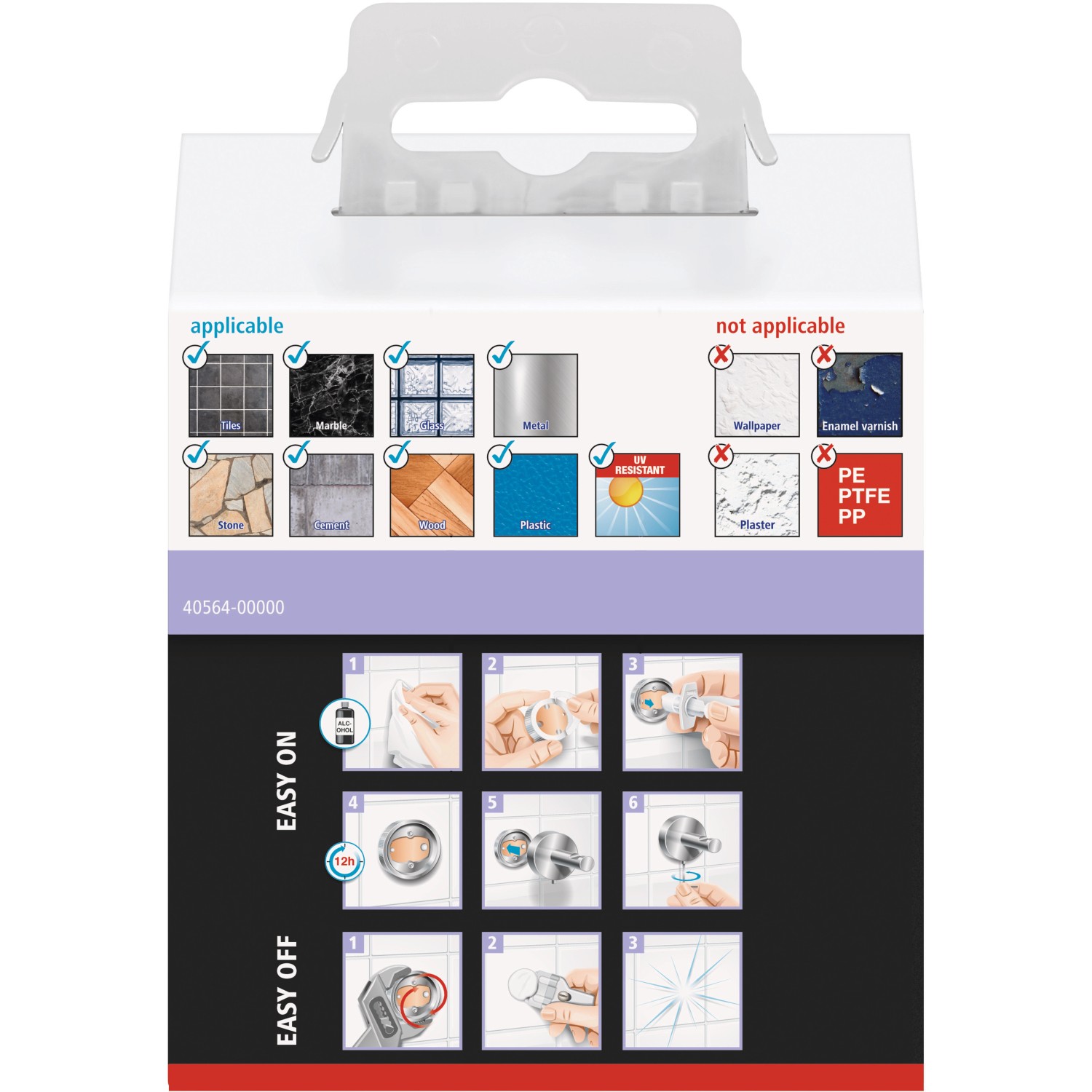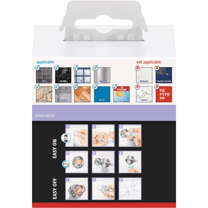 Práškovo lakovaný držiak možno ľahko pripevniť na stenu bez vŕtania pomocou lepiaceho riešenia tesa. Veľkou výhodou je, že pri použití inovatívnej lepiacej technológie tesa "všetko v jednom" nehrozí poškodenie stien alebo dlaždíc pri montáži. Držiak je možné kedykoľvek odstrániť bez akýchkoľvek stôp a vďaka novému adaptéru BK20 ho môžete opätovne pripevniť na iné miesto.