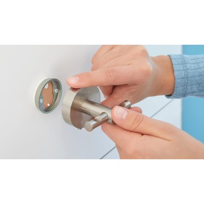 Zaoblený vodeodolný háčik tesa Moon je pekný a praktický. Jeho vzhľad nerezovej ocele s úpravou proti odtlačkom prstov a atraktívny dizajn upútajú pozornosť a pritom môže slúžiť na zavesenie mnohých rôznych potrieb v kúpeľni, či už sú to župany, uteráky alebo kozmetické tašky. Vŕtanie nie je potrebné, pretože technológia tesa Power.Kit je spoľahlivé a dlhodobé lepiace riešenie.