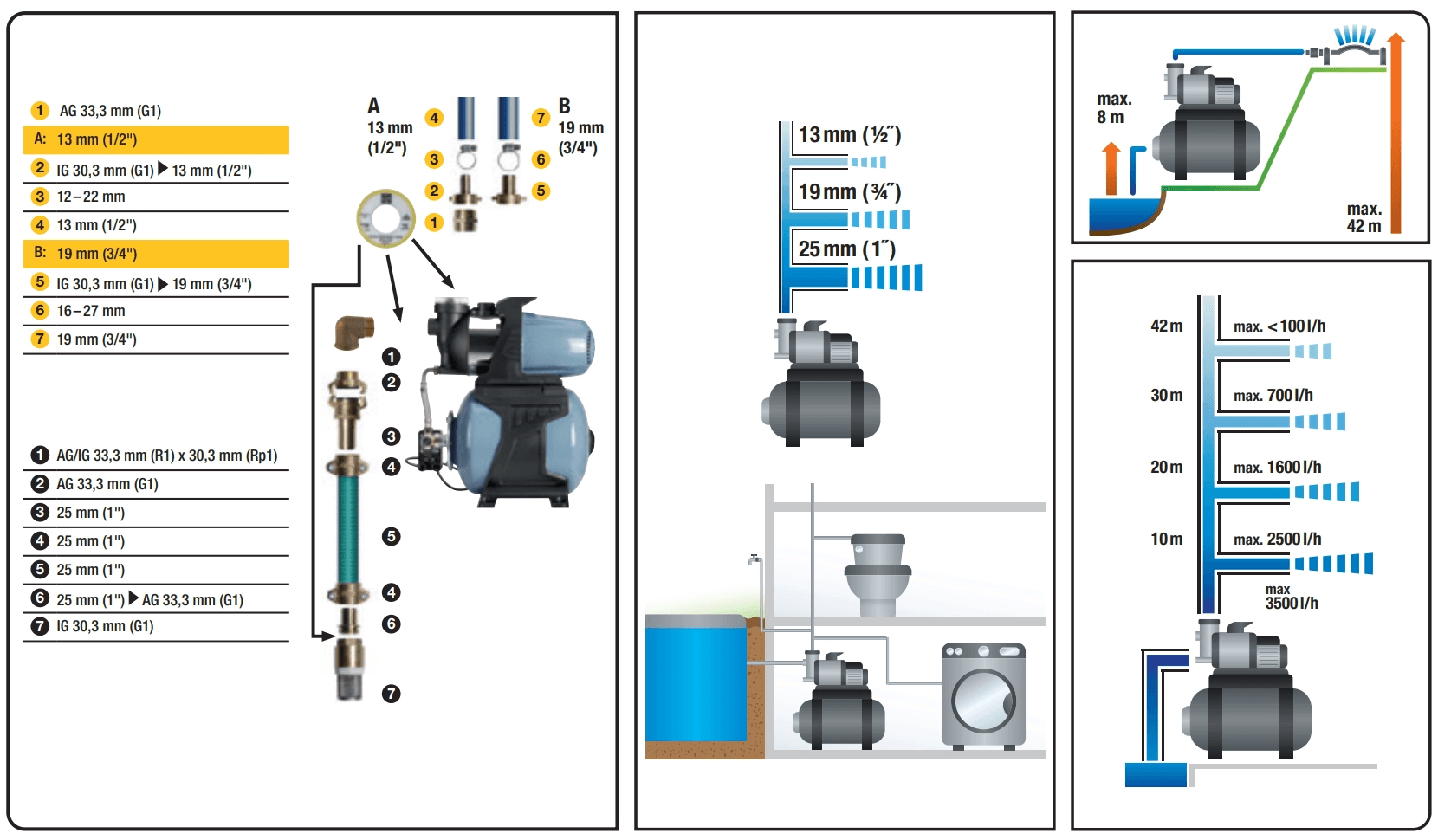 <p><strong>Automatická domáca vodáreň HWW 3500 s predfiltrom</strong><br>Táto domáca vodáreň GWW 3500 s menovitým výkonom 1000 W a maximálnym prietokom 3500 l/h je určená pre polostacionárne a stacionárne použitie na čerpanie čistej vody v dome alebo na záhrade, napríklad na odčerpávanie čistej vody z cisterien či nádrží na vodu, na kropenie a zavlažovanie, a ako čerpadlo na studničnú, dažďovú a úžitkovú vodu. Prístroj nie je koncipovaný pre nepretržitú prevádzku alebo ako filtračné čerpadlo.</p><p>Vodáreň je vybavená integrovaným manometrom, ktorý umožňuje presné sledovanie tlaku vody, ako aj tlakovým spínačom na automatickú reguláciu vody. Integrovaný predfilter chráni čerpadlo pred znečistením a predlžuje jeho životnosť.</p><p>Či už na záhrade alebo v dome - táto domáca vodáreň zaujme svojou účinnosťou, odolnosťou a všestranným využitím.</p><p><strong>Technické parametre</strong><br>Model: HWW 3500<br>Menovité napätie: 230 V-, 50 Hz<br>Menovitý výkon: 1000 W<br>Max. čerpané množstvo: 3500 l/h (0,00097 m3/s)<br>Max. prevádzkový tlak: 4,2 bar<br>Max. plniaci tlak: 2 bar<br>Max. výška čerpania: 42 m<br>Max. sacia výška: 8 m<br>Max. teplota čerpaného média: 35 °C<br>Max. veľkosť nečistôt: 1 mm<br>Objem tlakovej nádrže: 19 l<br>Dĺžka prívodného kábla: 1,2 m<br>Stupeň krytia: IPX4</p>