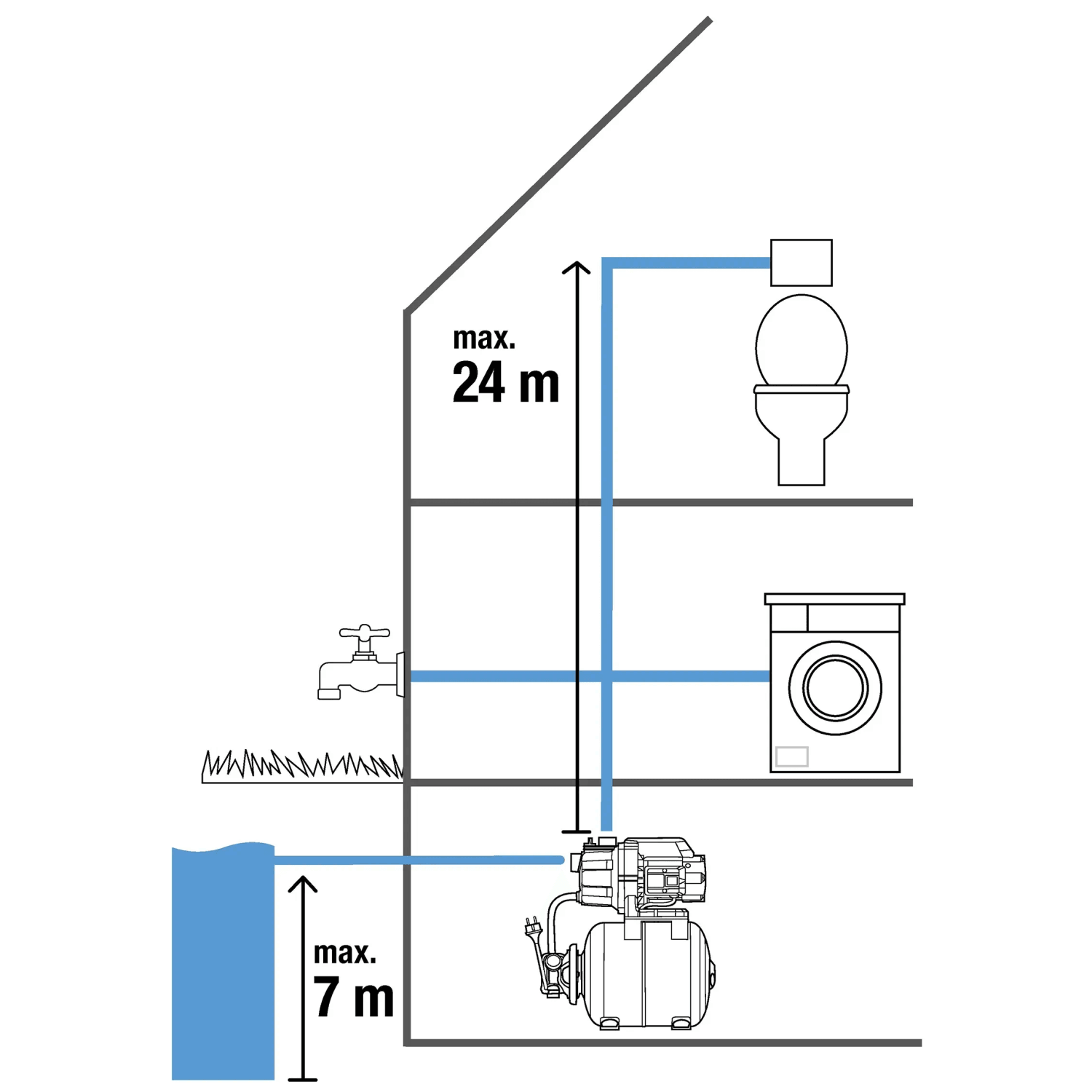 Gardena domáca vodáreň 3000/4 je vaše riešenie pre automatické zásobovanie domácnosti a záhrady vodou. Stacionárna vodáreň sa rýchlo a ľahko inštaluje a môže distribuovať vodu zo sudov s dažďovou vodou, studní alebo cisterien tam, kde je potrebná. Tým, že pomocou čerpadla dopravíte vodu k svojmu vodovodnému kohútiku v záhrade, do svojej práčky alebo k nádržke na splachovanie toalety môžete ušetriť vodu, znížiť náklady a byť šetrnejší k životnému prostrediu.