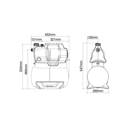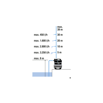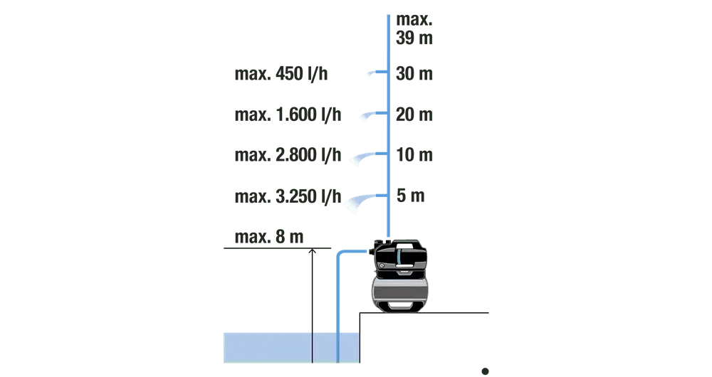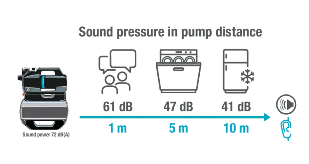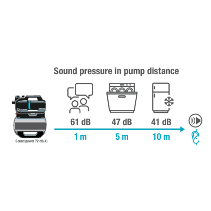 Vzhľadom na to, že môže čerpať vodu z veľkej akumulačnej nádrže, funguje extrémne ticho a hospodárne. Tlakové čerpadlo je výkonné s dopravnou výškou 39 metrov (3,9 bar) a prietokom 3800 litrov za hodinu. Nízka spotreba energie iba 600 W podčiarkuje vysokú účinnosť vodárne s nemeckým dizajnom. Čerpadlo má tichú prevádzku, pretože plastové tlmiace puzdro znižuje hladinu hluku na maximálne 47 dB(A) akustického tlaku vo vzdialenosti 5 m. Gumové nožičky zaisťujú, že čerpadlo stojí pevne a pracuje s nízkymi vibráciami. Základňu je možné taktiež priskrutkovať k podlahe skrytým spôsobom.
