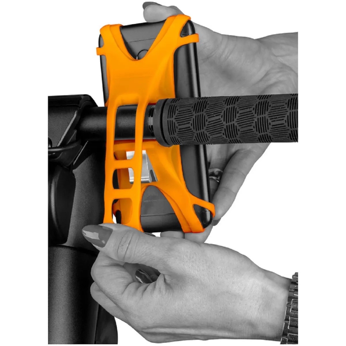 Silikónový držiak telefónu pre nadšených užívateľov mobilných aplikácií a ešte väčšiu bezpečnosť jazdy. Športovo ladený v kontrastnej oranžovej farbe.