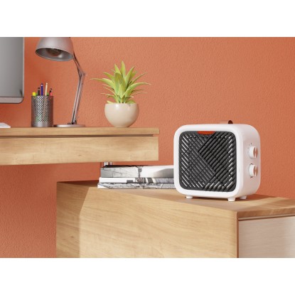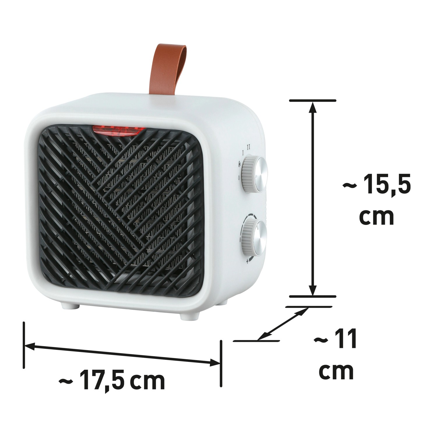 Vďaka kompaktným rozmerom cca 17,5 cm x 15,5 cm ho možno bez problémov umiestniť na písací stôl, podlahu alebo do malých výklenkov. Uistite sa, že medzi ohrievačom a nábytkom, závesmi atď. je bezpečnostná vzdialenosť 50 cm smerom nahor a po stranách a 120 cm dopredu. Nízka hmotnosť, šikovný tvar a praktické pútko navyše umožňujú jednoduchú prepravu z miestnosti do miestnosti, takže môžete kúriť alebo vetrať vždy tam, kde to práve potrebujete.