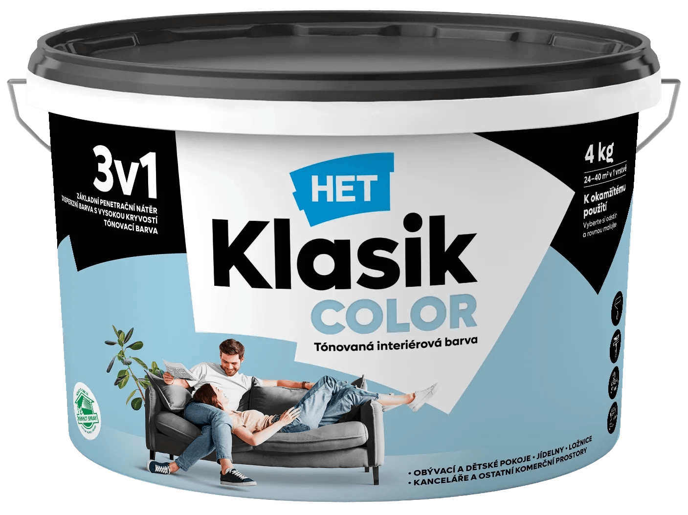 Tónovaná interiérová disperzná oteruvzdorná farba HET Klasik COLOR je najobľúbenejšia farba na trhu. Je ideálny pre obývacie a komerčné priestory, detské izby, jedálne, chodby, kancelárie, predajné priestory a ďalšie.