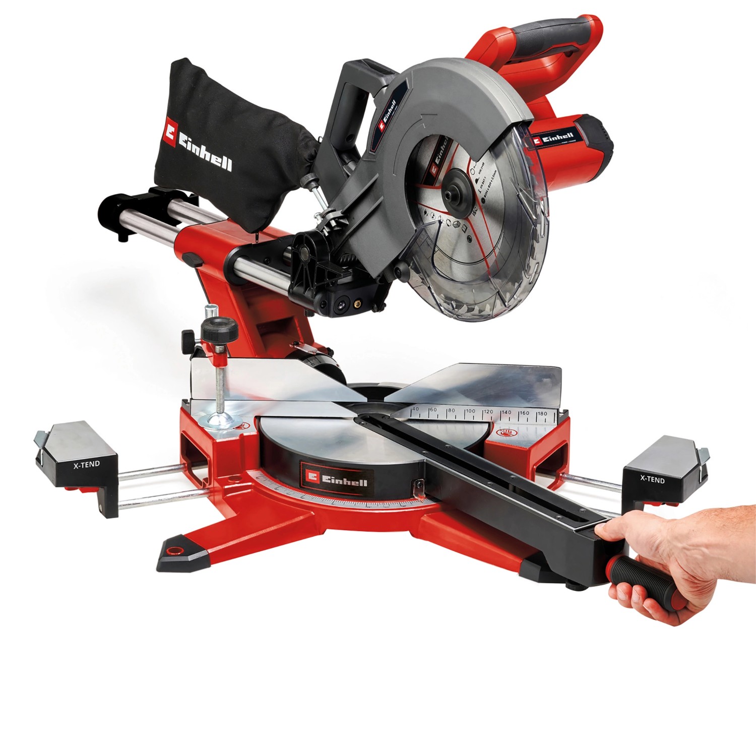Pokosová píla Einhell s pojazdom sa vyznačuje hladko bežiacim posuvným mechanizmom, ktorý je vhodný aj pre širšie obrobky. Podpery obrobku X-Tend je možné nastaviť iba jednou rukou a bez náradia. Upínacie zariadenie zaručuje bezpečné držanie obrobku na mieste. Otočný stôl umožňuje presné nastavenie pre šikmé rezy. Okrem toho je možné hlavu píly nakloniť až o 45° doľava pre vykonávanie pokosových rezov.