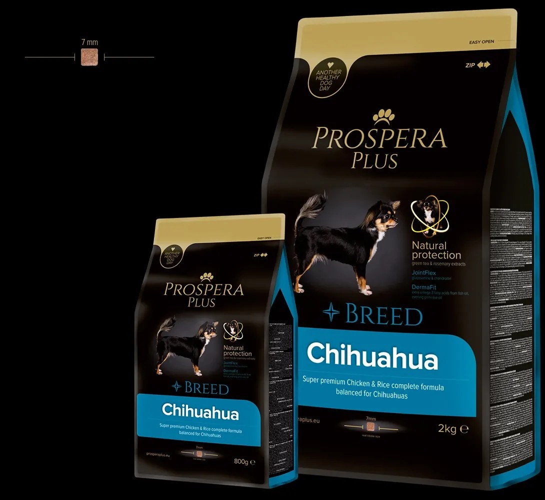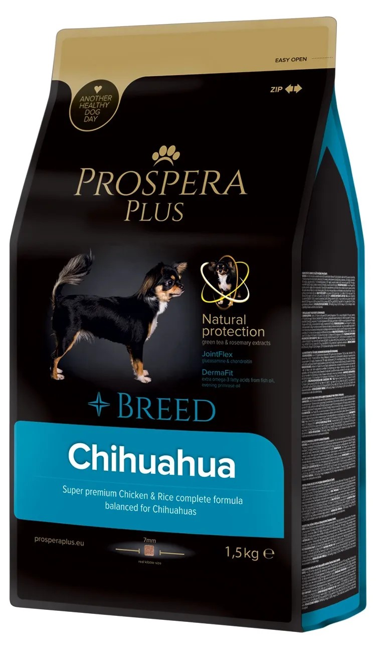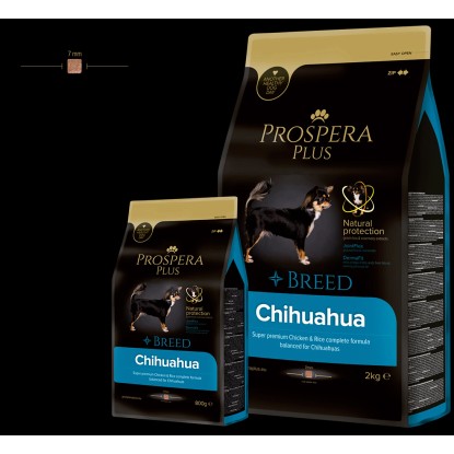 PROSPERA PLUS Chihuahua je superpremiové krmivo, navrhnuté s ohľadom na unikátne výživové potreby plemena Čivava. Základom receptúry je kvalitné ľahko stráviteľné kuracie mäso doplnené o funkčné prísady extraktu zo zeleného čaju a rozmarínu ktoré posilňujú imunitu psíkov. Krmivo je obohatené o rybí tuk (omega 3 mastné kyseliny) a pupalkový olej, ktoré podporujú zdravú srsť tohto plemena. Chondroprotektíva glukosamín a chondroitín pomáhajú posilňovať a stabilizovať kosti a kĺby. Špeciálny tvar granúl pomáha na prevenciu pred zubným kameňom a plakom.