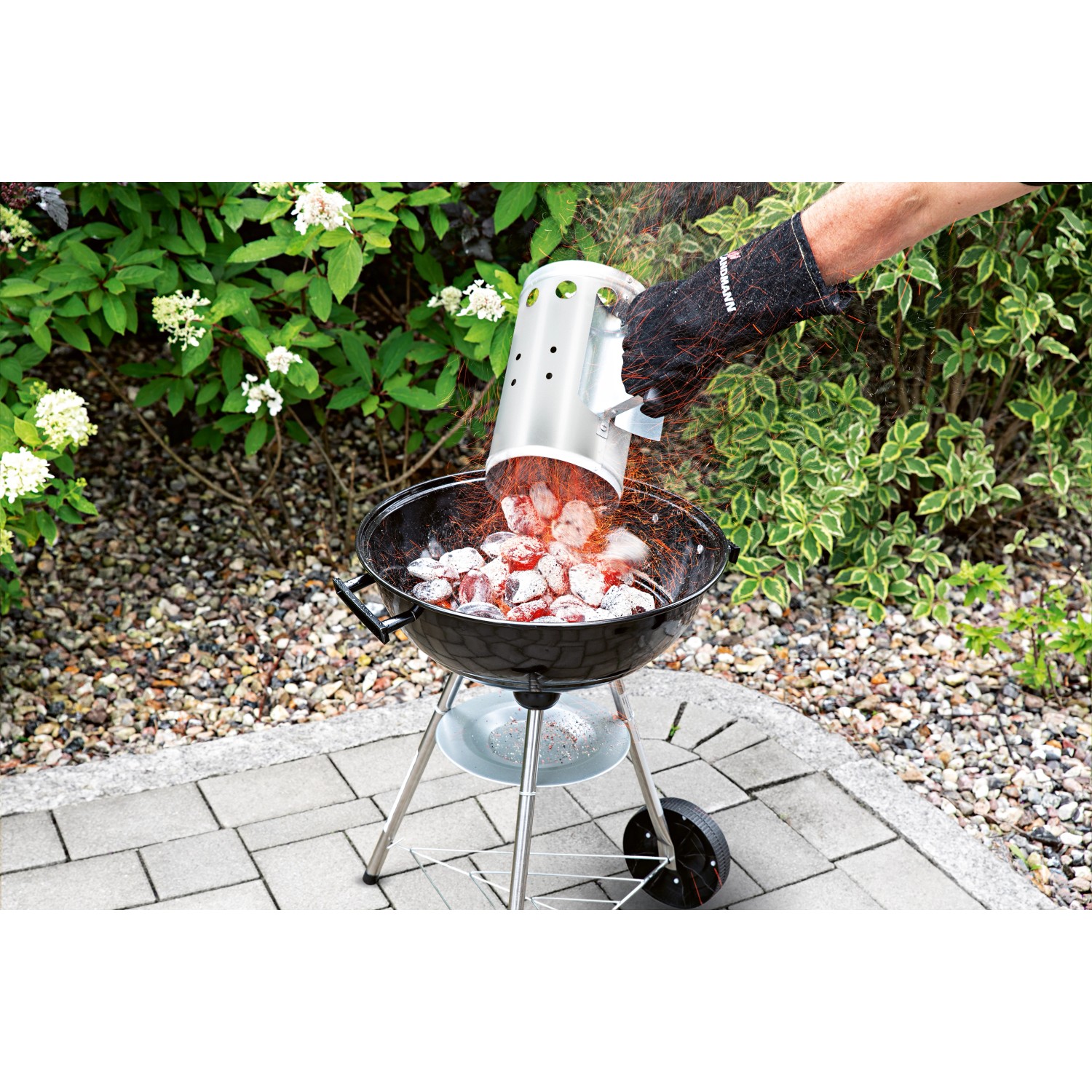 3) Po rozžeravení uhlíkov cca po 20 minútach zdvihnite komínový štartér pomocou rukoväte a nasypte drevené uhlie do grilu