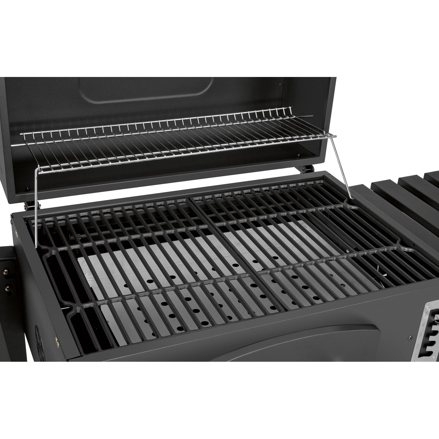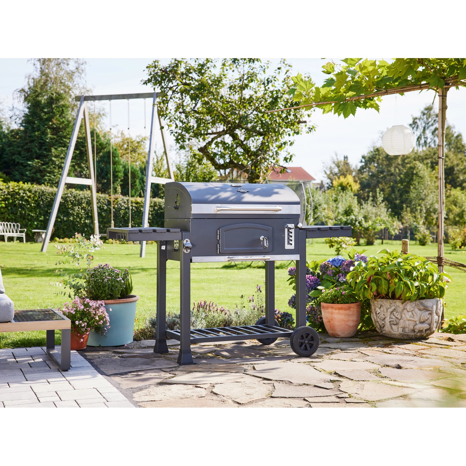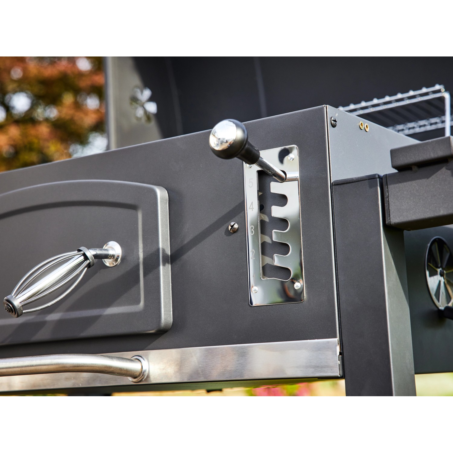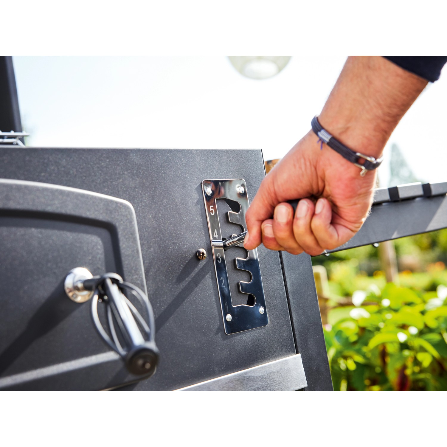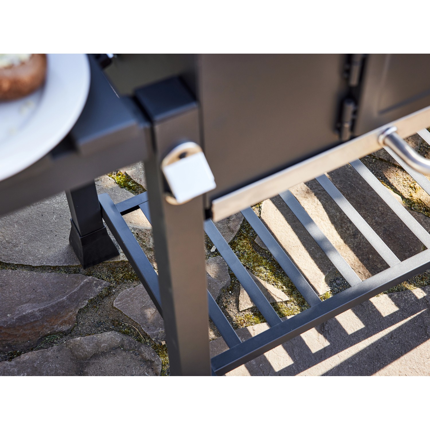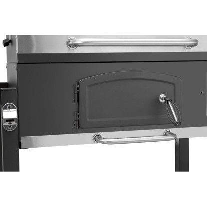 Vďaka veku grilu dosiahnete požadovanú grilovaciu teplotu rýchlejšie. Keramicky smaltované veko je vybavené integrovaným teplomerom. Odolný teplomer Vám umožní ľahko sledovať teplotu vo vnútri vášho grilu a regulovať teplotu vo vnútri grilu pomocou regulácie vzduchu na bočnej strane grilu. Navyše môžete nastaviť žiaru pri grilovaní pomocou výškovo nastaviteľnej priehradky na drevené uhlie v 3 polohách. Popol padá do priehradky/popolníka pod grilom, čo veľmi uľahčuje následné čistenie grilu.