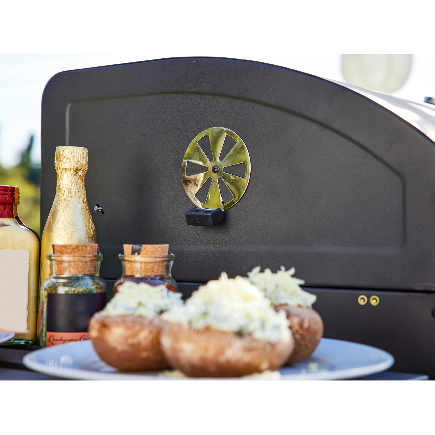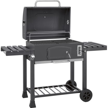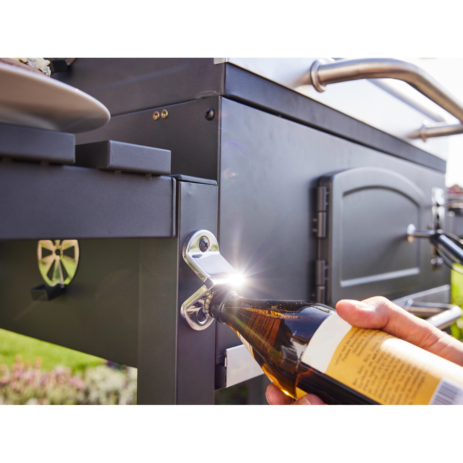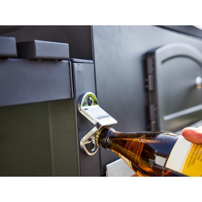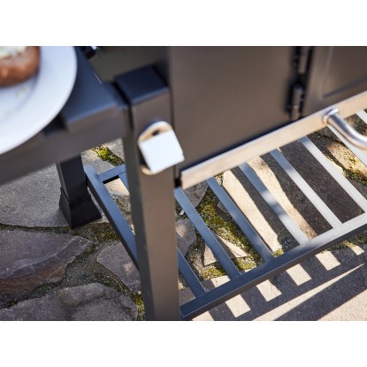 Tento gril je vybavený dvoma postrannými stolíkmi, pre všetky vaše nevyhnutnosti, ktoré pri grilovaní potrebujete. Postranné stolíky sú skladacie, a tak ich môžete sklopiť, keď ich práve nebudete potrebovať. Spolu s dvoma praktickými kolesami je tento gril ľahký na skladovanie, pretože nezaberie toľko miesta. Praktickým príslušenstvom na grilovačku je otvárač fliaš umiestnený na boku grilu.
