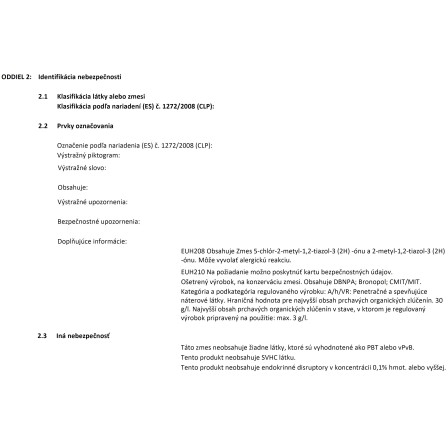 Penetrácia obsahuje povrchovo aktívne látky, odpeňovače a konzervačné látky. Neobsahuje ťažké kovy.