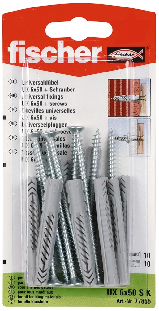 Univerzálne hmoždinky Fischer UX sú inteligentné hmoždinky vhodné takmer do každého stavebného materiálu od betónu a tehál, po sadrokartón až drevo. Sú vhodné ako do plných, tak aj dutých materiálov. Hmoždinka UX spozná v akom materiáli sa nachádza a pokiaľ sa nachádza v dutom materiáli, zárezy po stranách hmoždinky umožnia jej zauzlovanie. Nová poistka proti pretočeniu v tvare pílových zubov zabraňuje pretáčaniu hmoždinky vo vyvŕtanom otvore. Tieto hmoždinky sú vyrobené z vysoko kvalitného nylonu a preto sú veľmi pevné, pružné a majú dlhú životnosť. Golier hmoždinky zamedzuje zapadnutiu hmoždinky do materiálu a kryje vyvŕtaný otvor.