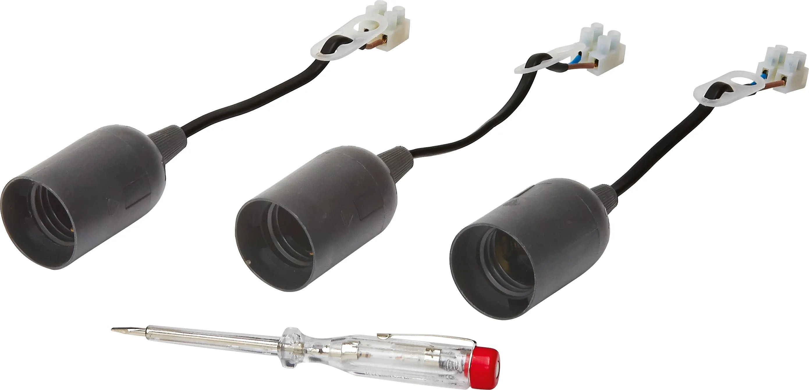 Čierna objímka žiarovky E27 sa optimálne hodí na osvetlenie pri renovačných prácach a je vybavená priehľadným zakončením s ľubovoľne nastaviteľnou dĺžkou do 15 cm. Kábel je 2-pólový. Do objímky sa zmestí kábel s priemerom 0,75 mm. Menovité napätie je 250 V, menovitý prúd 4 A. Pribalená skúšačka napätia dĺžky 14 cm deteguje str./js. napätie 100 V - 250 V. V balení sa nachádzajú 3 objímky žiarovky a skúšačka napätia.
