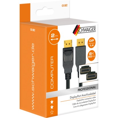 Prepojovací kábel SCHWAIGER je určený na pripojenie PC alebo notebooku a monitora, TV alebo projektora a je plne kompatibilný so štandardmi DP 1.3 a 1.2. Ponúka najvyšší výkon pre najnáročnejšie aplikácie pri prenose digitálnych audio a video signálov. Robustné, pozlátené konektory zaisťujú bezpečný prenos signálu, zatiaľ čo optimalizovaná ochrana proti zalomeniu zabraňuje zlomeniu kábla.