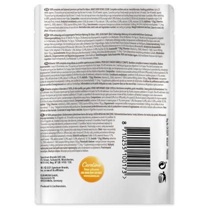 Mäso a živočíšne deriváty (kuracie mäso 28 %, bravčové mäso 6 %), oleje a tuky (rybí olej 0,2 %), deriváty zeleninového pôvodu ( vláknina z cukrovej repy 0,6%), minerály.