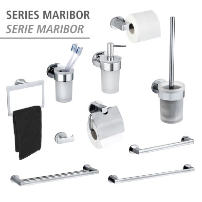 Doplnky pekne tvarovanej kúpeľňovej série Maribor majú lesklý povrch. Elegantní pomocníci do kúpeľne sú vyrobené z nerezovej ocele s montážnou úchytkou zo zinkového tlakového odliatku a prepožičiavajú kúpeľni luxusný nádych. Doplnky je možné upevniť pomocou priloženého systému UV-Loc. Na štandardné upevnenie sú súčasťou dodávky skrutky a hmoždinky.