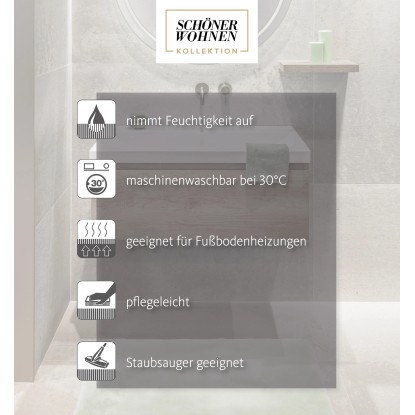 Pocit ako mäkká chôdza po obláčiku - kúpeľňové predložky Bali z kolekcie Schöner Wohnen zaistia pôžitok z bosej chôdze v kúpeľni. Veľmi hebký povrch zaručuje príjemne teplé nohy a navyše udržuje podlahu suchú. Kúpeľňové predložky sa hodia do kúpeľní s podlahovým vykurovaním a je možné ich prať v práčke na 30 °C. Protišmyková spodná strana navyše bráni kĺzaniu rohožky na hladkej podlahe. Tri veľkosti, ktoré sú k dostaniu, sa zaručene hodia do každej kúpeľne, a to pred sprchou, vaňou alebo umývadlom, a perfektne uľahčujú kombinovanie s ďalšími kúpeľňovými doplnkami.