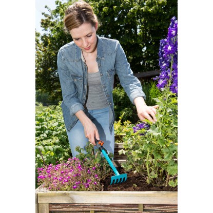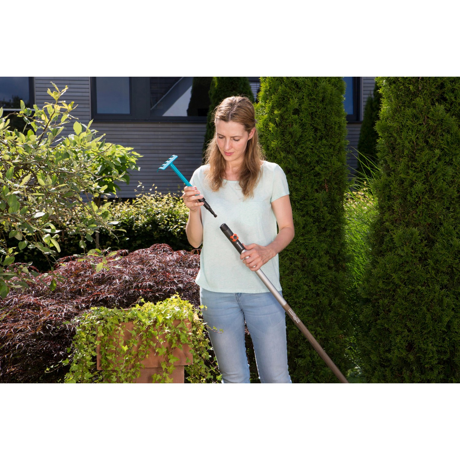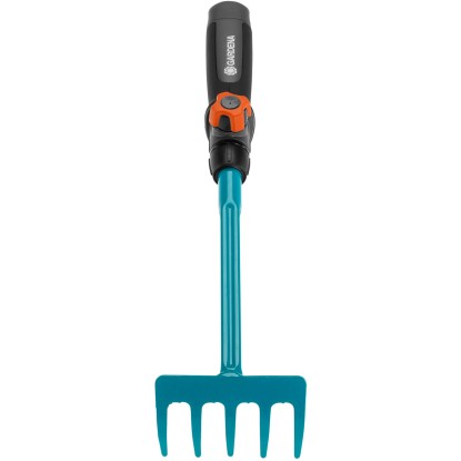 Gardena combisystem hrabličky na kvety sú optimálne vhodné na čistenie a skyprenie, ako aj na vyrovnanie pôdy. Ergonomicky tvarová rukoväť so zapracovaným mäkkým komponentom sedí perfektne v ruke a je na konci zahnutá, aby sa nemohla zošmyknúť. Na pohodlnú prácu bez zohýbania je možné rukoväť jednoducho odobrať a nahradiť ľubovoľnou násadou combisystem. Na tento účel sa rukoväť jednoducho uvoľní nad skrutkou z mäkkého plastu, nasadí sa iná násada a pevne sa zaskrutkuje.