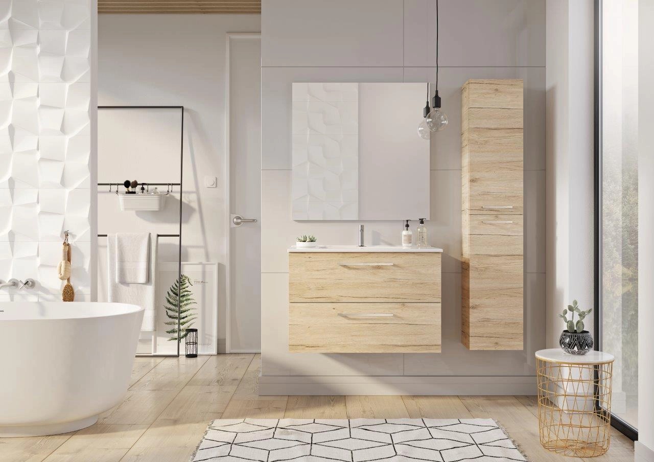 Kúpeľňové skrinky a regály sú vyrobené z kvalitných materiálov - korpus z laminovanej dosky, skrinky majú čelo z MDF dosky a sú doplnené pochrómovanými kovovými úchytkami. Povrch skriniek potiahnutý melamínom je odolný voči vlhkosti a ľahko sa čistí. Praktickým detailom je zatváranie SoftClose, vďaka ktorému sa zásuvky a dvierka zatvoria jemne a ticho.