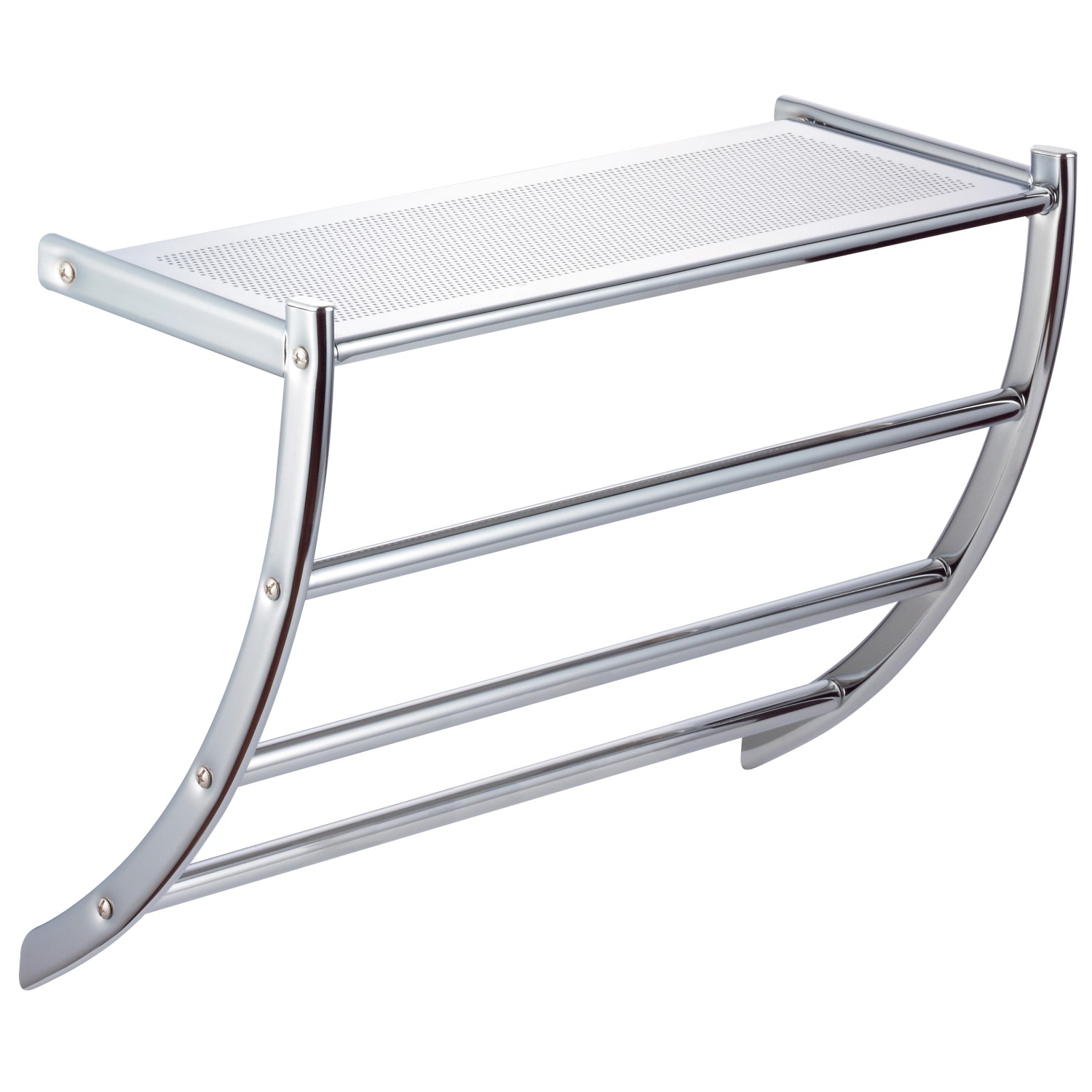 OBI kúpeľňový regál Anaga je vyrobený z pochrómovaného kovu a vybavený 3 držiakmi na uteráky a jednou odkladaciou plochou.